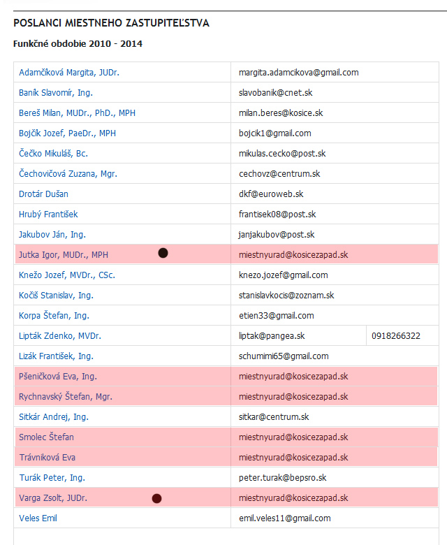 Poslanec je verejne činná osoba, ktorá má SLÚŽIŤ občanom. Ale ako, keď na e-maily nereagujú a neodpovedajú. Keď si pozriete zoznam poslancov na webstránke mestskej časti (http://kosicezapad.sk/poslanci/), tak zistíte, že okrem mňa, nemá žiadny poslanec zverejnené telefónne číslo. Taký Prešov s tým nemá problém – http://www.presov.sk/portal/?c=12&id=15067. No poslanci MČ áno. Dokonca viacerí poslanci majú ten istý e-mail (miestnyurad@kosicezapad.sk), na ktorý keď pošlete niečo, ako keby ste to vyhodili vonku oknom (sám som to skúsil niekoľkokrát a poznám aj iných), čo ja osobne považujem za urážku voči občanovi. A váš osobný e-mail si prečíta kde-kto okrem poslanca… Čiže žiadny osobný e-mail, žiadna adresa, žiadne telefónne číslo… Nič.