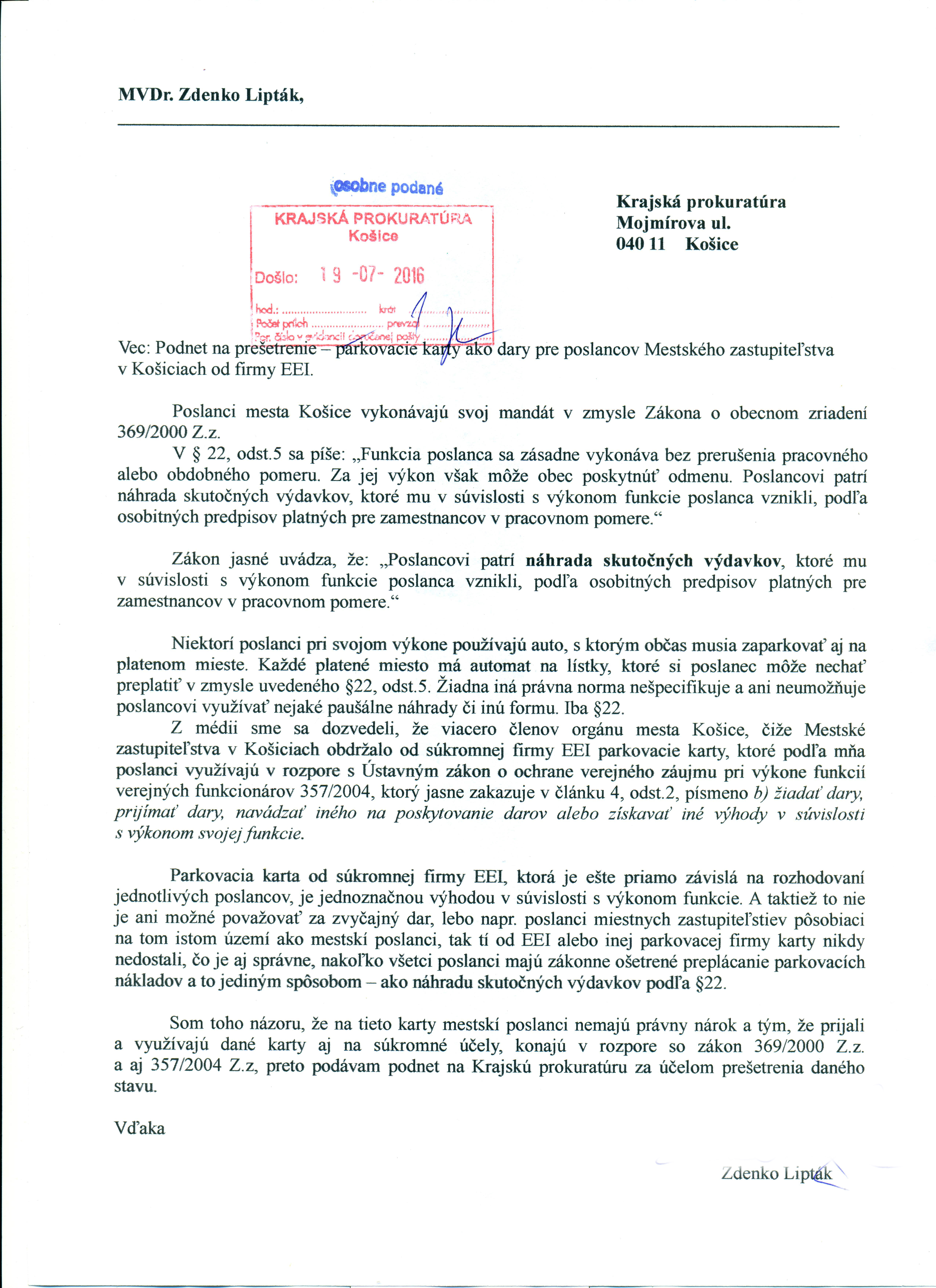 Dňa 11.08.2016 bolo doručené stanovisko Krajskej prokuratúry Košice k podnetu zo dňa 19.07. 2016