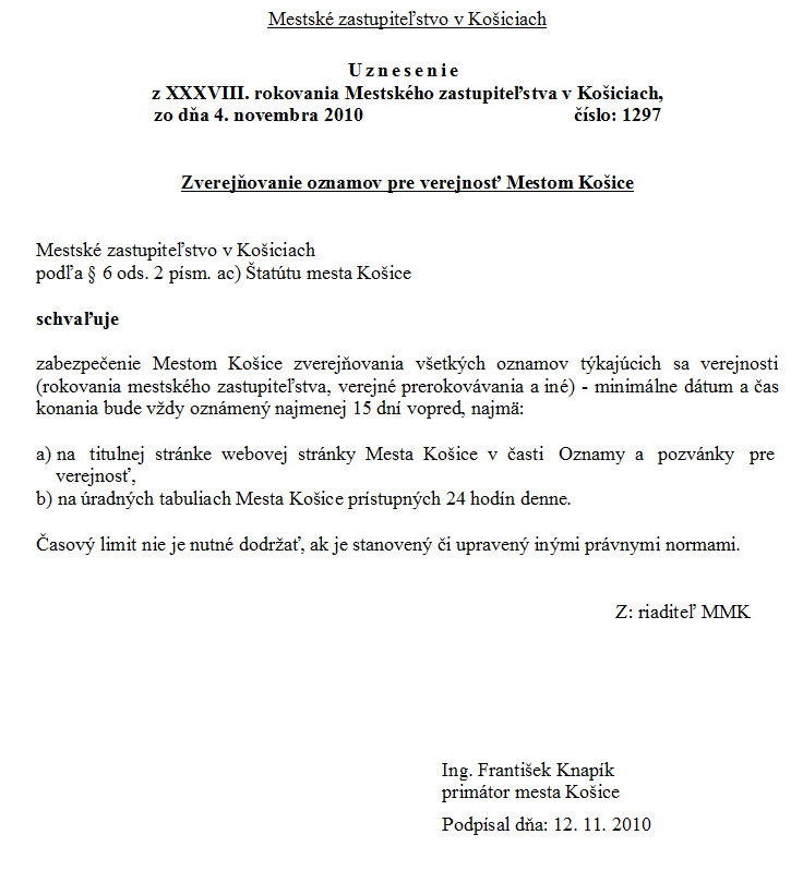 No, keď sa tak naša súdružka Lenártová odvoláva na dodžiavanie interných predpisov, tak ja by som jej chcel ako námestníčke primátora pripomenúť interný predpis mesta Košice a to uznesenie Mestského zastupiteľstva v Košiciach číslo 1297 zo dňa 4. novembra 2010, v ktorom sa píše o 15-dňovej oznamovacej povinnosti mesta Košice, ktorá dosť často je mestom Košice nedodržiavaná.