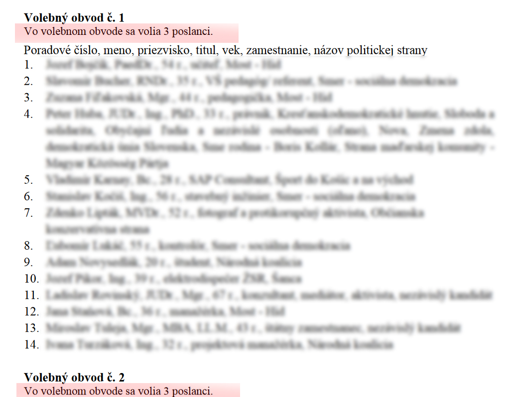 Pri volebných obvodoch však uvádza nepravdivý údaj a to, že: „ Vo volebnom obvode sa volia 3 poslanci“, čo nie je pravda. Správny údaj je, že: „ Vo volebnom obvode sa volia maximálne 3 poslanci“.