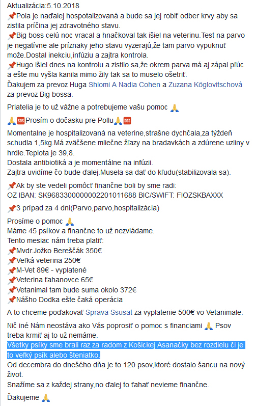 Už dlhšiu dobu sledujem na Facebooku, že množstvo psíkov, o ktoré sa starajú dobrovoľníci, sú vlastne psíkovia odchytený asanačnou službou (zmluvný partner mesta Košice), ktoré boli odchytené a umiestnené v zariadení odchytovej/asanačnej služby, z ktorého ich dobrovoľníčky po niekoľkých dňoch vezmú často v horšom stave, v akom boli pri odchytené.