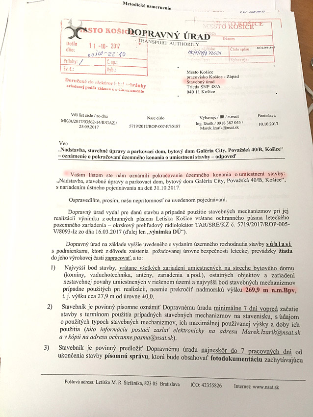 Stavebný úrad mesta Košice ale vydal stavebné povolenie s tým, že nad 8 n.p. sa môže vybudovať ďaľšie byty ako ustupujúce podlažie o ploche 470 štvorákov pre 4 byty, že sa musí dodržať nadmorská výška 279,9 m.n.m (úradník stavebného úradu musel požiadať Dopravný úrad o výnimku a „nezávislý“ Dopravný úrad rukou nejakého „nezávislého“ odborníka vydal výnimku !!! Výnimka sa dáva ale výnimočne a na niečo výnimočné. Ako je možné, že stavebný úrad vôbec požiadal o výnimku v rozpore so schválenými regulatívami? A šokujúce je, že Dopravný neskorumpovaný úrad vydal výnimku. Kto za toto dostane výpoveď ?