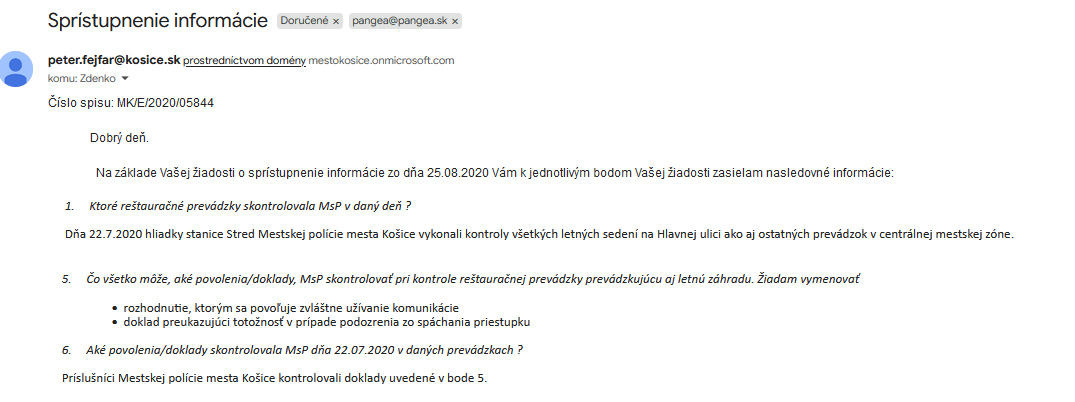 Dňa 25.07.2020 som vykonal poslanecký prieskum – kontrolu v centre mesta pri daných 2 problémových podnikoch. Po mojej kontrole som požiadal cez infožiadosť MsP informáciu, že ktoré letné terasy vlastne kontrolovala. A tu je odpoveď: