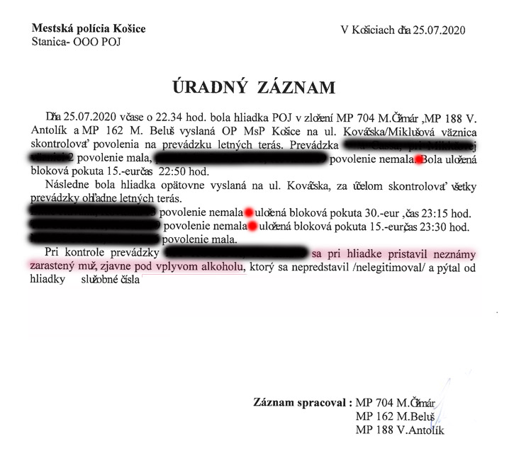 V úradom zázname ma ale šokovala jedna vec. Bolo tam uvedené, že pri hliadke MsP sa zastavil neznámy zarastený muž zjavne pod vplyvom alkoholu… Tým mužom som mal byť ja, lebo ja som sa pri nich zastavil. MsP veľmi dobre vedela, že kto bol ten neznámy muž, lebo 2x som v ten večer volal na 159 (veď preto urobili kontrolu 2x) a vždy som sa predstavil, že kto som a čo som. Je zarážajúce, že hliadka do ÚRADNEHO záznamu napíše a policajti sa podpíšu, že…..zjavne pod vplyvom alkoholu, pritom ja defacto nepijem (alkohol) a to aj celé mesiace. A ak, tak iba pivo a aj to iba v lete. Toto bola ale príprava na konfrontáciu a protiútok, lebo do 159 som povedal, že toto si prerokujeme o pár dní na zastupiteľstve (ktoré sa nakoniec nekonalo kvôli covidu) ). Viem si živo predstaviť, ako by sa po mojej kritike na rokovaní košického parlamentu postavil náčelník MsP Pavelčák a ako rodený kresťan a demokrat by povedal, že čo chcem, veď som bol zjavne pod vplyvom alkoholu, čo dosvedčia aj 2 mestskí policajti, ktorí túto lož aj podpísali. Až tak hlboko klesla Mestská polícia v Košiciach.